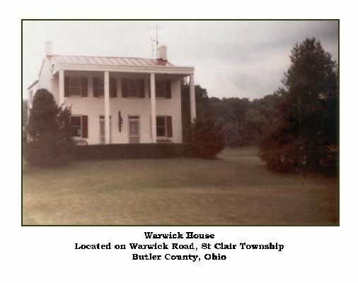 9. WARWICK family lived in St. Clair township on Warwick Road. (picture of the house) Later, they moved from Butler County to Warren County, where there is more information provided by Vivian K Moon (Nov 18, 2003)